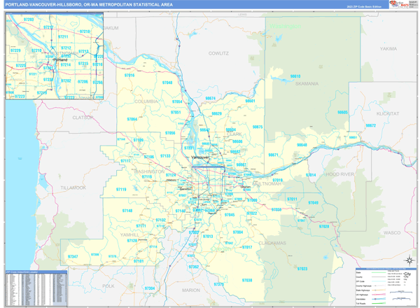 Portland Vancouver Hillsboro, OR Metro Area Wall Map Basic Style